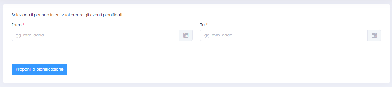Qui, inserendo data di inizio e di fine, è possibile generare le pianificazioni durante quell'arco di tempo. Una preview viene mostrata e la conferma viene richiesta:
